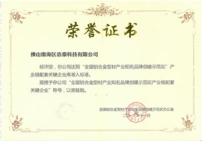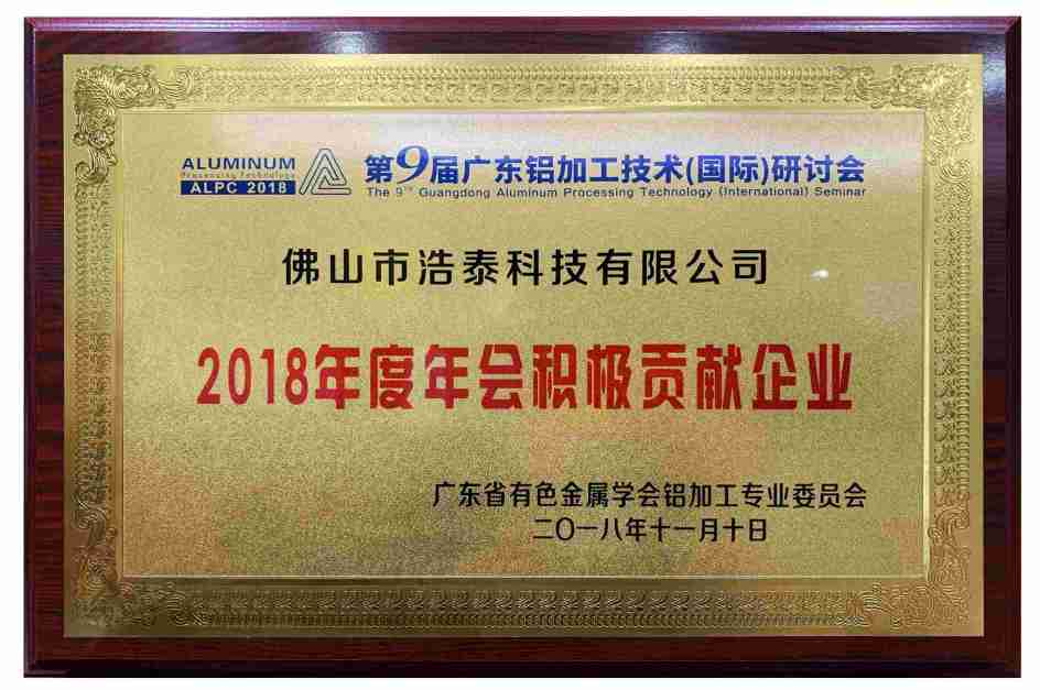 2020年浩泰科技榮獲佛山市鋁加工協會頒發的“積極貢獻獎”。