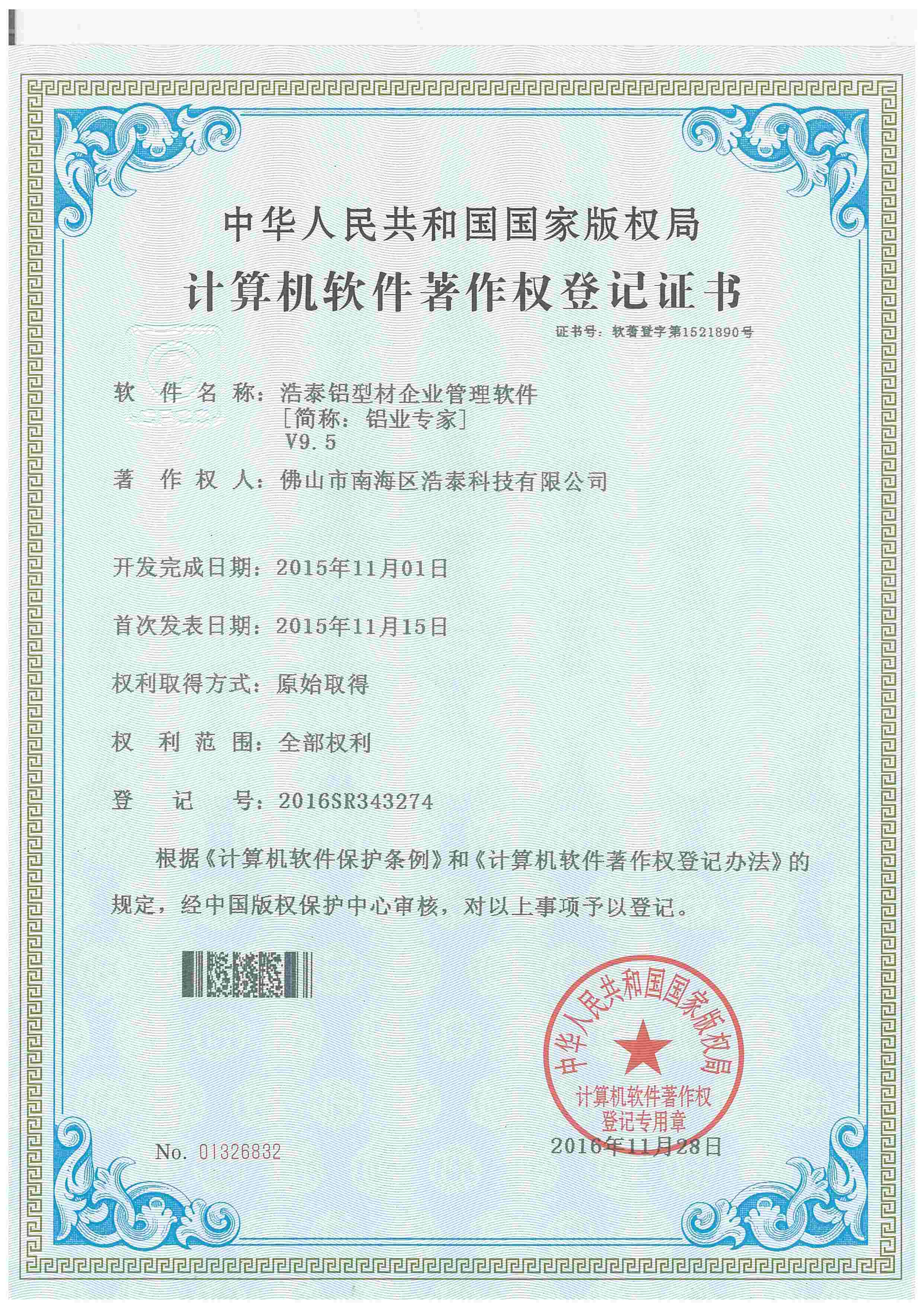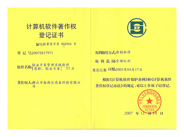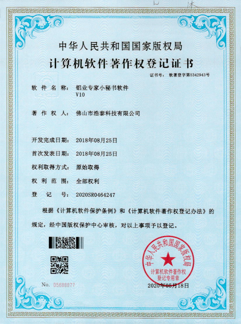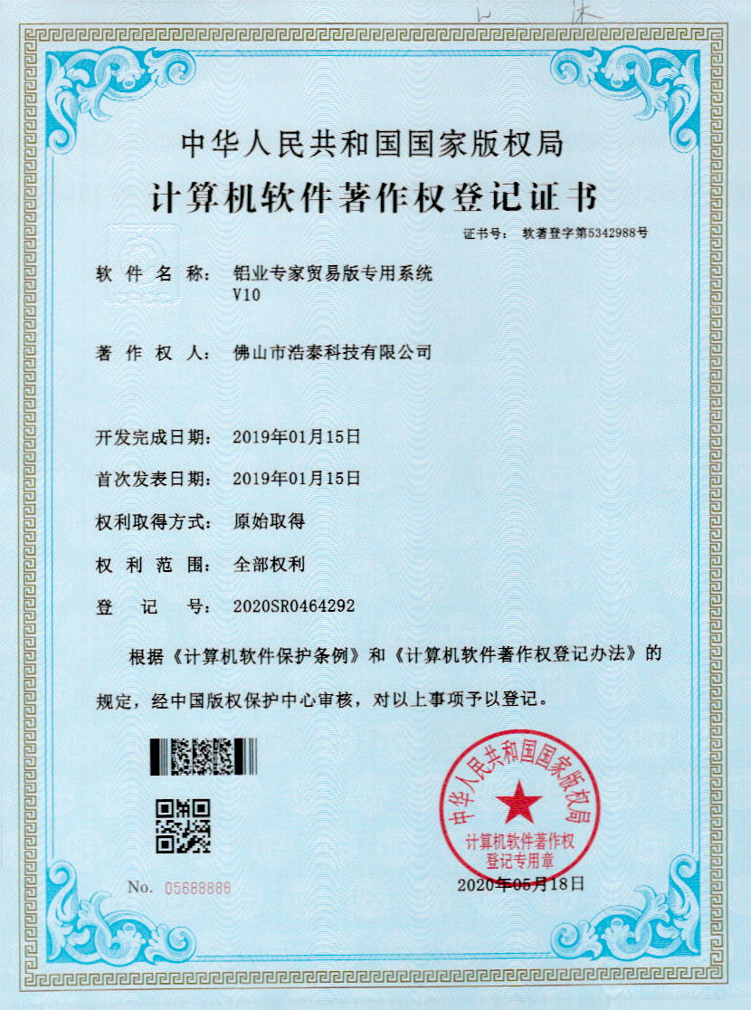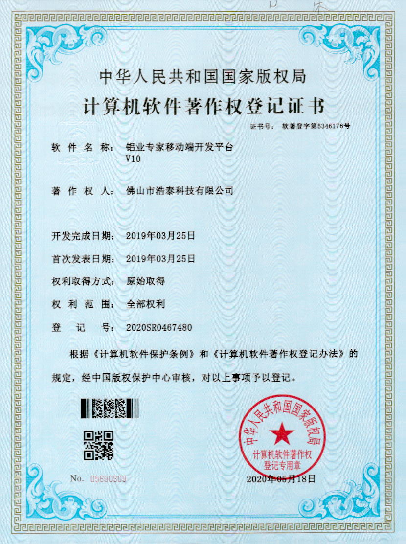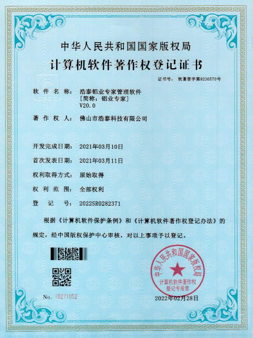 浩泰鋁箔專家系統V1.0,浩泰鋁商家管理軟件V1.0,浩泰鋁模板生產管理系統V1.0,浩泰項目管理系統V1.0,浩泰訂單中心管理軟件V1.0,浩泰鋁業專家工業版管理軟件V1.0,浩泰建材租賃信息系統V1.0,浩泰啟航平臺V2.0,浩泰移動辦公中心軟件V1.0,10個軟件商標注冊成功,鋁業專家云端ERP上線,同時我司取得高新技術企業榮譽!