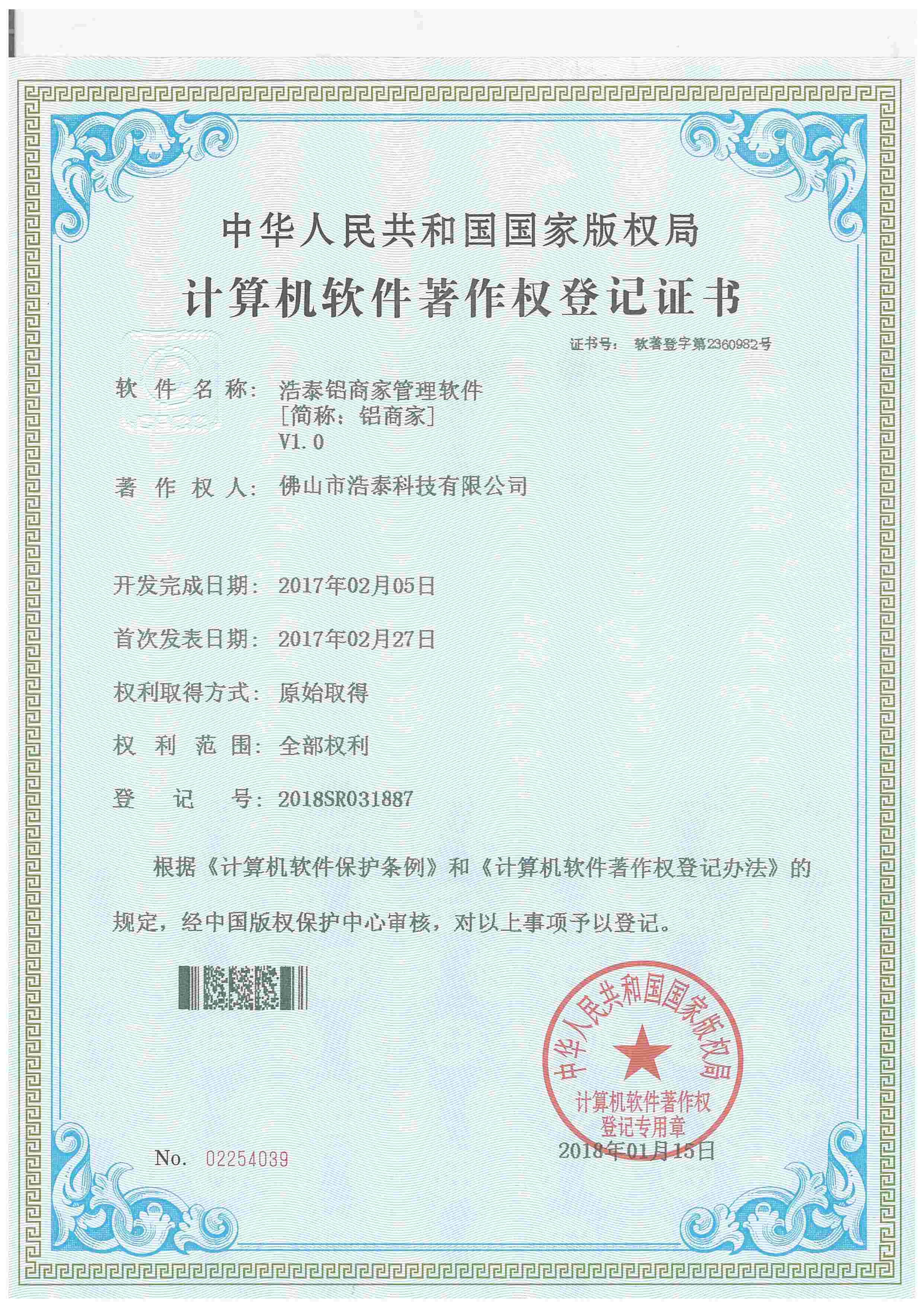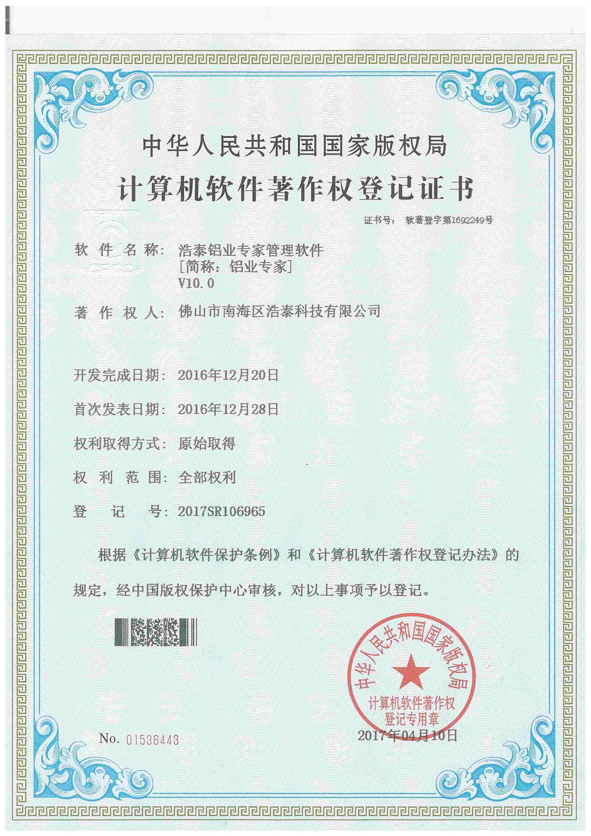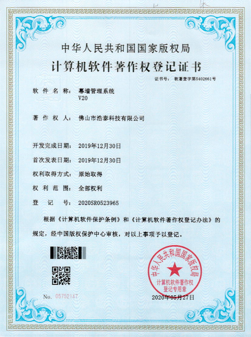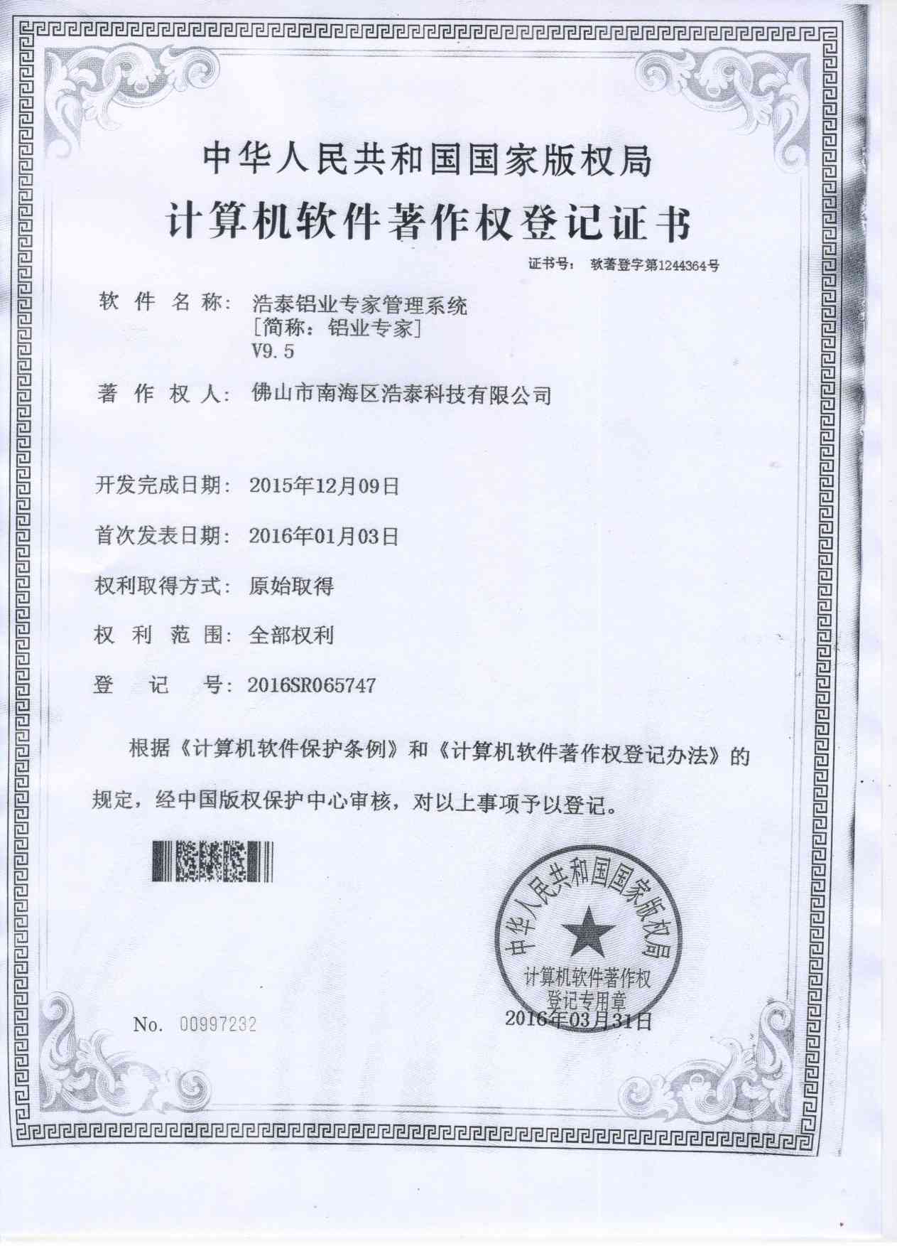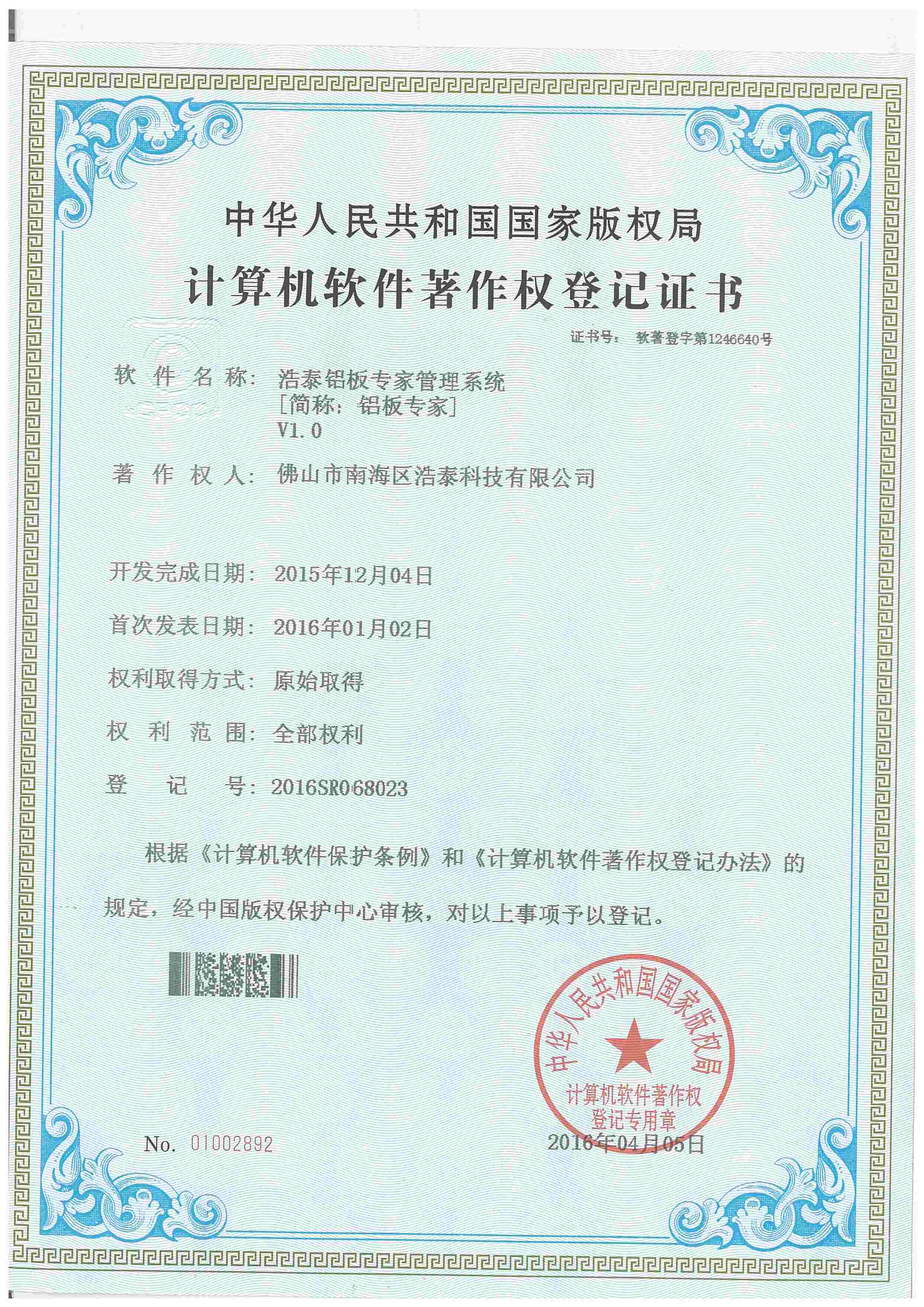 浩泰鋁箔專家系統V1.0,浩泰鋁商家管理軟件V1.0,浩泰鋁模板生產管理系統V1.0,浩泰項目管理系統V1.0,浩泰訂單中心管理軟件V1.0,浩泰鋁業專家工業版管理軟件V1.0,浩泰建材租賃信息系統V1.0,浩泰啟航平臺V2.0,浩泰移動辦公中心軟件V1.0,10個軟件商標注冊成功,鋁業專家云端ERP上線,同時我司取得高新技術企業榮譽!