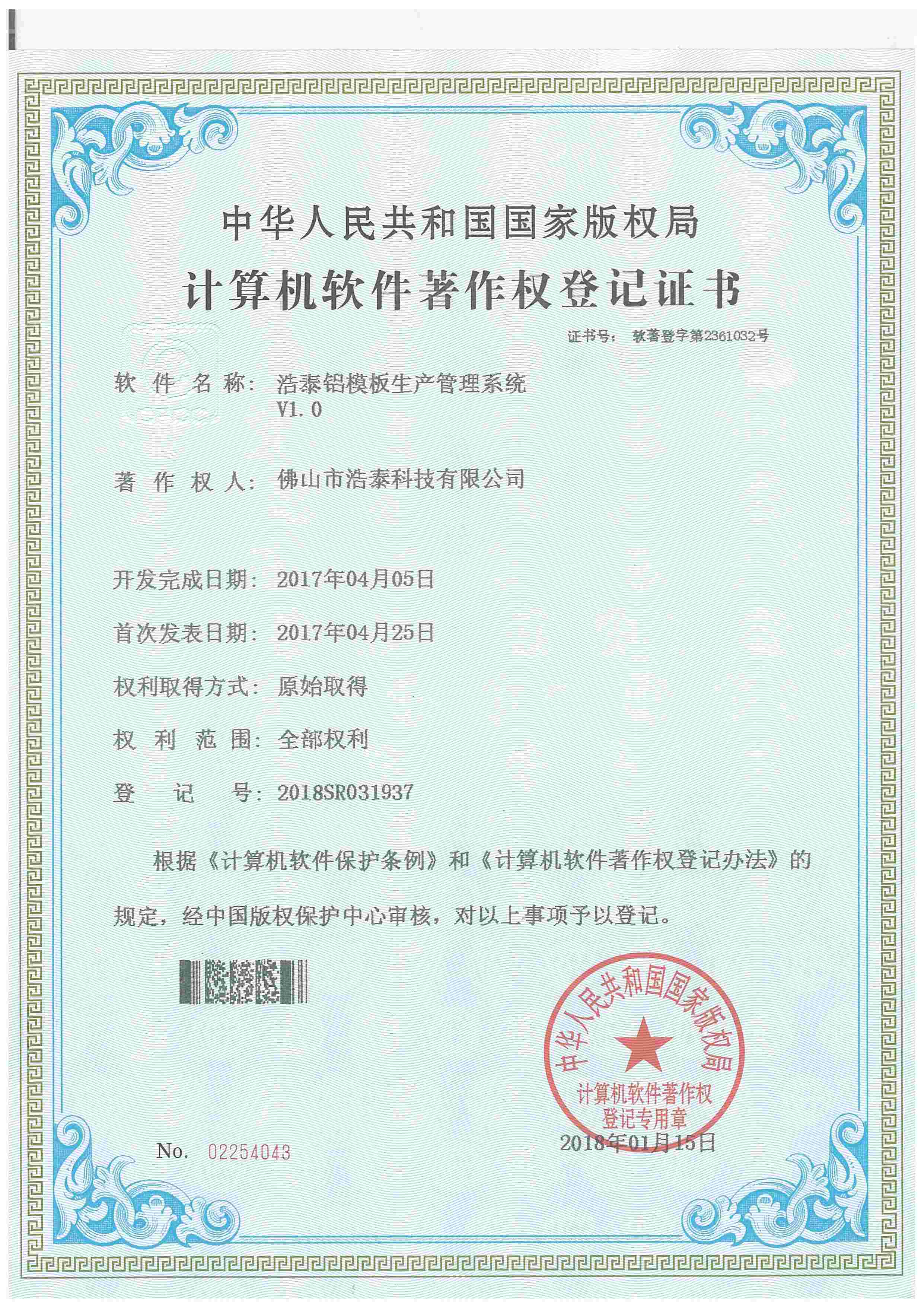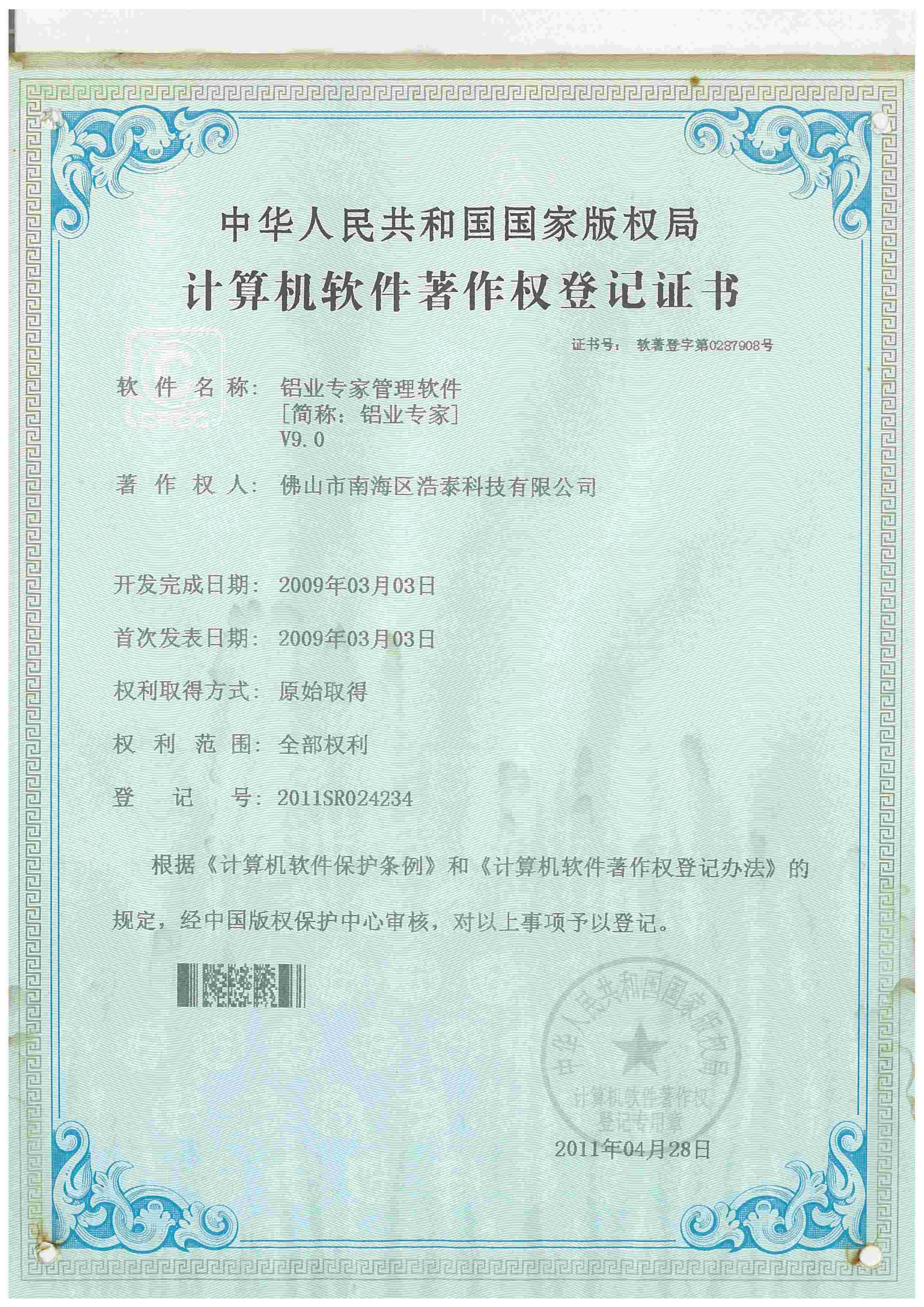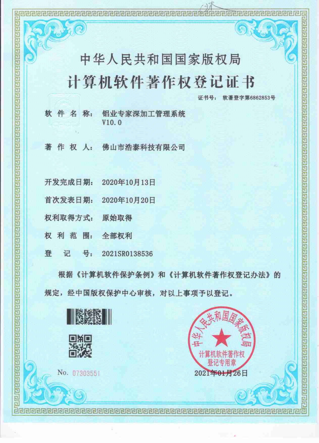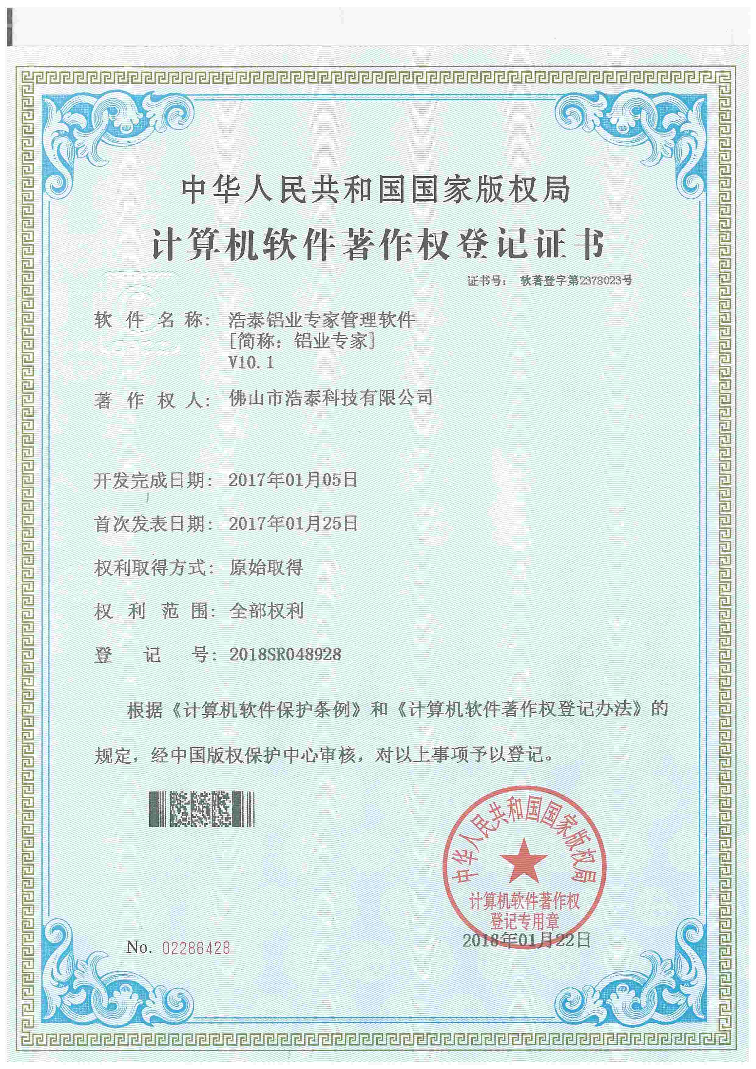 浩泰鋁箔專家系統V1.0,浩泰鋁商家管理軟件V1.0,浩泰鋁模板生產管理系統V1.0,浩泰項目管理系統V1.0,浩泰訂單中心管理軟件V1.0,浩泰鋁業專家工業版管理軟件V1.0,浩泰建材租賃信息系統V1.0,浩泰啟航平臺V2.0,浩泰移動辦公中心軟件V1.0,10個軟件商標注冊成功,鋁業專家云端ERP上線,同時我司取得高新技術企業榮譽!