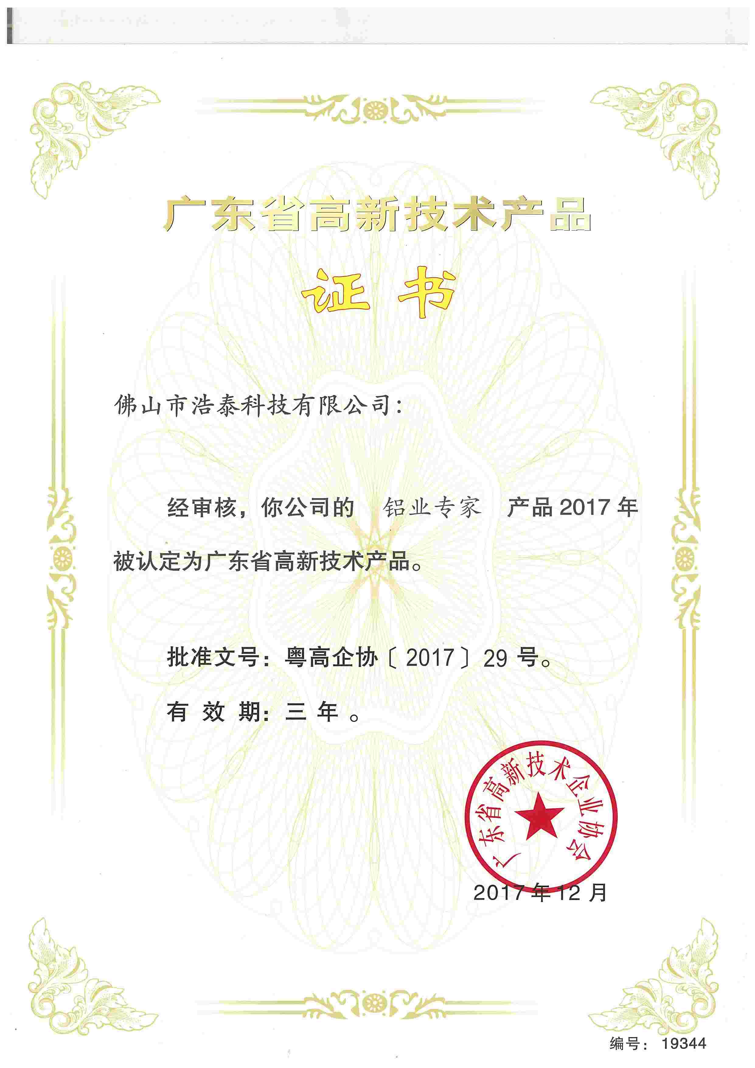 鋁業專家-廣東省高新技術產品證書